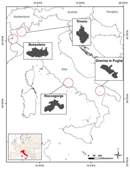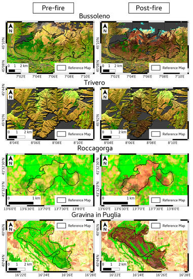 Bussoleno and Trivero are situated in the Alpine mountain range. The fire events occurred in 2017 and 2015, respectively, both during the fall season and after an extended drought season. Roccagorga and Gravina in Puglia are situated in the Apennine mountain range, and the fire events occurred during a harsh summer dry season in 2017. The characteristics of the study areas and the information about the fire events are reported in Table 1.