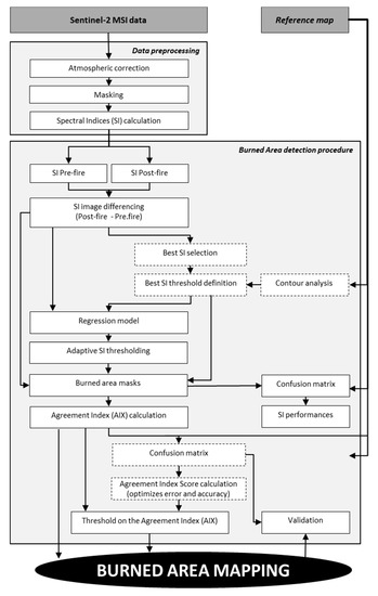 Figure 4. Workflow of the main phases of the procedure for burned area mapping. Dashed line boxes refer to training phases. SI: spectral index.