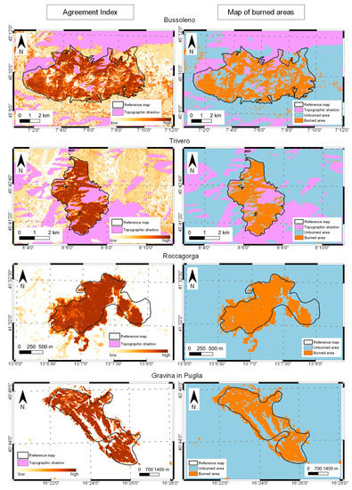 Figure 5. Spatial distribution of the Agreement IndeX (AIX) and maps of burned areas for the four study cases.