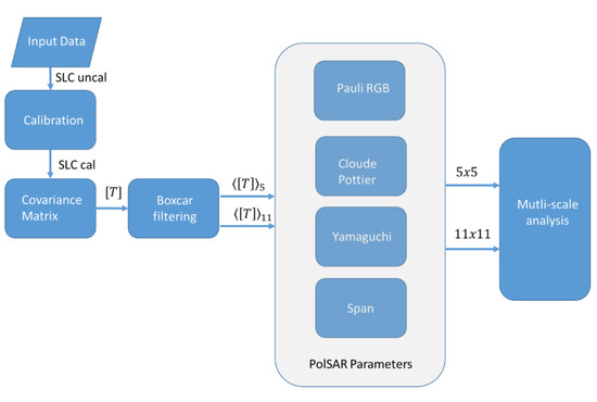 Block diagram outlining the methods of the study. The covariance matrix was built before main multi-scale analysis. Note that Pauli RGB refers to the RGB image and without it, the other steps would not have been carried out.