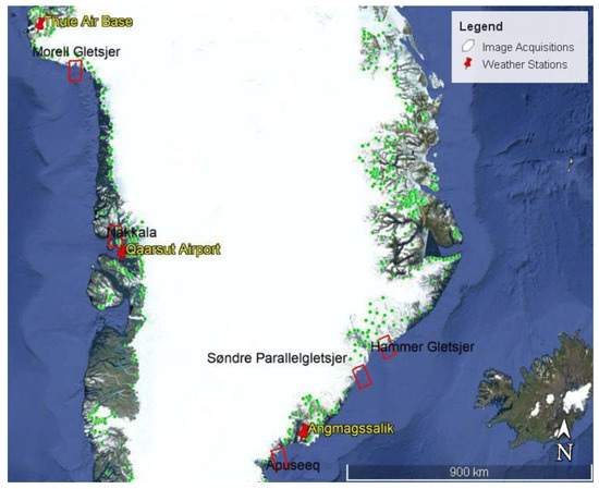 Google Earth image of data acquisition. Red pinpoints indicate the weather observation stations, with names shown in yellow labels. Red boxes indicate the image footprints. Green dots indicate GIS data for Greenland glacier locations. Glaciers names are in black. White compass point indicates north. 900 km indicates the scale of the image.