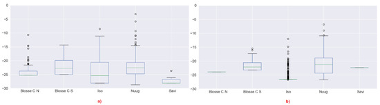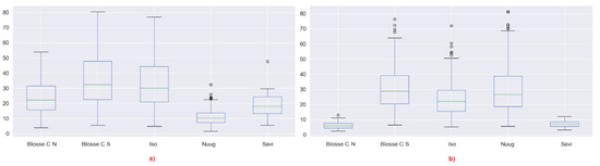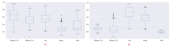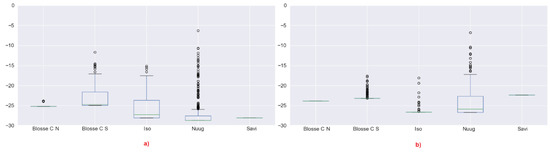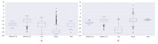 The first step was to input ALOS-2 quad-pol data and calibrate them into the appropriate SAR real and imaginary parts for each image. The radiometric calibration we applied on all images simply removes the output scaling applied by the SAR focusing processor and formatting as sigma naught (normalised radar cross section). However, it does not convert data in dB, since we are interested in the Single Look Complex (SLC) format. The next step in processing the quad-pol data was to derive the structure of the covariance matrix, which will reveal the second order statistics of the partial target once the averaging is applied. We applied averaging using two filters either of 5 × 5 (which corresponds to 25.5 × 21.5 m) or 11 × 11 (which corresponds to 56.1 × 47.3 m). After the filtering, the data (in covariance matrix format) are ready to be processed for extracting decomposition parameters (Cloude–Pottier, Yamaguchi) or other observables (Pauli RGB and span). A list of all the polarimetric parameters used is in Table 2.