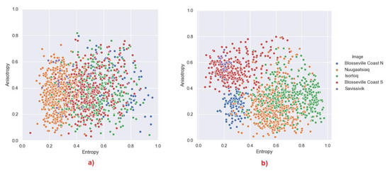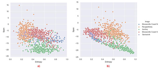 - Blosseville Coast N and S and Savissivik are an interesting case, since several icebergs reduce their entropy when increasing the window. Inspecting the images, we revealed that these are smaller icebergs and when increasing the window, we included the edge pixels, which are generally brighter. We therefore included in the window other dominant scatterers that increase the entropy. Please note, we used the middle pixels of the icebergs because we are interested in the scattering behaviour of the ice body, in order to improve our understanding of icebergs. If we had to include the edges for all the icebergs, we may have masked the inner behaviour. Nevertheless, when the icebergs are small, excluding the edge is simply not an option. This is also true for detection studies in which iceberg edges could be critical to identify icebergs [30].