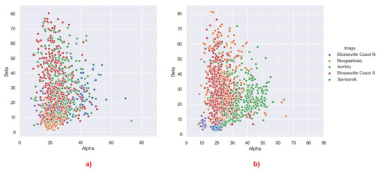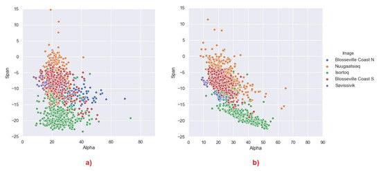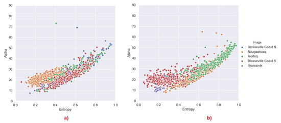 Figure 3 presents the Pauli RGB image for Blosseville Coast N. The RGB Pauli component represents the elements of the Pauli vectors in linear scale. Since the scale does not allow us to see details, Figure 4 presents a visual close-up identification of an area of the image with an abundance of icebergs. The figure also includes the corresponding alpha and entropy for both averaging window sizes. Looking at the Pauli RGB, it is easy to identify icebergs in the channel area. The image was acquired in August. The sea area seems to be a mix of open ocean, thin sea ice (bluish areas), small floes and icebergs. Please note how the bright points (generally with shadow features) appear to generally have a low alpha angle and a rather low entropy, which would suggest surface scattering mixed to volume scattering. Comparing 11 × 11 and 5 × 5, we can see the feature seems to be mostly consistent in these images, but the following plots will show that some differences exist.