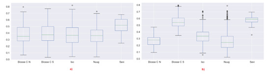 The values for the 5 × 5 window are mostly spread. This is most likely due to the fact that anisotropy requires a large average in order to be estimated properly. The results obtained in Figure 17 are therefore not to be taken as very significant. Once the window gets larger, we can start seeing some patterns. For instance, in Blosseville, the icebergs north and south of the glaciers seem to have different values of anisotropy. This is possibly due to different temperature effects with some presence of surface liquid water. Although, it is unlikely that icebergs in Blosseville Coast N are very wet because looking at the entropy and span, this seems to be a minor difference. Interestingly, this minor difference is visible when going to observe the two less dominant scattering mechanisms, by using the anisotropy. Specifically, the colder condition in Blosseville Coast S produces a higher entropy, which means that the second scattering mechanism is much stronger than the third. This is in line with the idea that the radiation is having a bigger penetration in the ice body and the surface scattering is accompanied by some dipole/volume scattering within the iceberg. More data will be needed on other glaciers to prove this idea is correct.