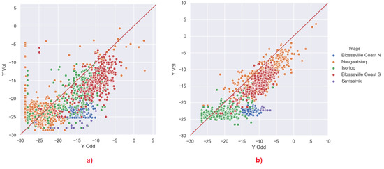 (a) Iceberg volume scattering, surface scattering plot in a 5 × 5 window, (b) 11 × 11 window. The majority of icebergs show surface scattering. Colour legend indicates image. Dots indicate icebergs. All values are in dB.