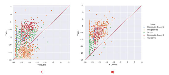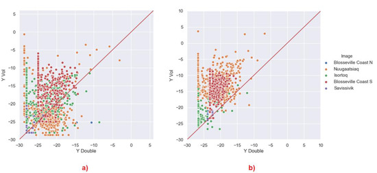 On first glance, in the volume vs. surface plot (Figure 22), when the backscattering signal is high, surface scattering seems to be dominant. Volume scattering becomes more dominant when the backscattering gets lower, maybe due to an increased penetration which will result in a reduction in surface scattering and an increased loss in the iceberg body. This also indicates the presence of features in the ice (cracks, crevasses, air bubbles, impurities and other features within the ice body) [22,24]. These results may indicate that the volume scattering, although present, may not be the dominant mechanism for these icebergs at L-band. In the surface vs. double bounce plot (Figure 24), it appears that surface scattering is again dominant in most of the icebergs with 5 × 5, except a few exceptions where the double bounce is stronger. Double bounce seems to be dominant only in a limited number of icebergs. However, when we compare double bounce to volume (Figure 23), the latter seems to be stronger in most cases. This shows that the pure double bounce reflection is again uncommon, and icebergs tend to have either surface or volume scattering, or a combination between surface and multiple reflections.