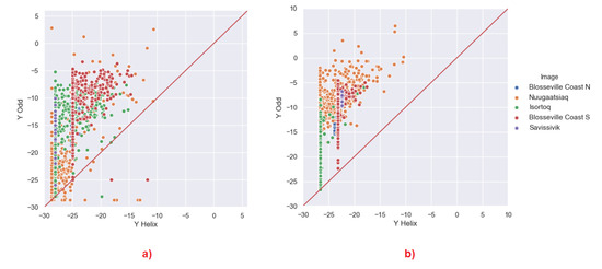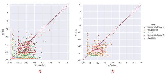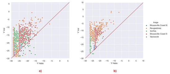 (a) Iceberg double bounce scattering, helix scattering plot in a 5 × 5 window, (b) 11 × 11 window. The majority of icebergs tend to show significant double bounce. Colour legend indicates image. Dots indicate icebergs. All values are in dB.