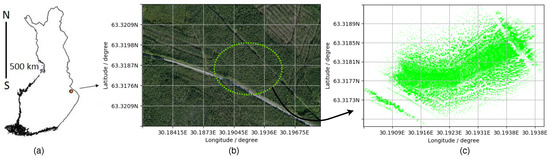 (a) The test site in Lieksa, Eastern Finland. (b) The forest canopy map from Google maps. (c) Point cloud map of the study area.