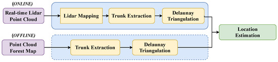Figure 3 shows an overview of our proposed method. The complete system takes as a sole input the point cloud data from the 3D lidar, and outputs the position and orientation estimation in the reference of the given global map. The system can be divided into six steps as illustrated in Figure 4. The former two steps are done offline by processing the point cloud data defining the global forest map. These steps have a computational complexity that grows linearly with the number of lidar points (first step) and with the number of trees in the map (second step). The latter four steps are then done online on-board the harvester to estimate its position in real time. The steps are: