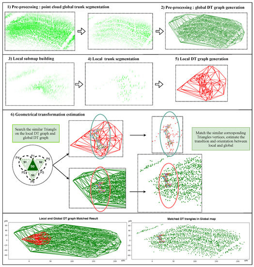 Our objective is to match the local trunk graph against a subset of the global trunk graph map , and the prerequisite is that there exist some sets of geometric structures that can be uniquely identified in both graphs, i.e., geometrically similar structures such as triangles or sets of triangles that are defined utilizing the trunks as vertices. From the trunk landmarks of the obtained as described in Section 2.4, we get the Delaunay triangulation .