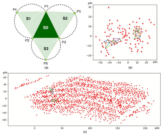 (a) The target triangle with its neighbors . (b) The all similar triangles found in the local trunk map, (c) the corresponding triangles found in global trunk map.