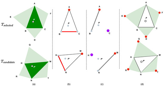 If , the vertices C and H are on the same side of the edge and edge , otherwise the two vertices are on the opposite. In the case shown in Figure 7c, the result is , so the vertex pairs are and . The last step is to match vertices in the triangle neighbors. Since we already know the correspondence between triangles and , we just need to get which two vertices are included in the neighboring triangles. For example, as we get the corresponding pairs of vertices and from last two steps, the last vertices E and Q are a match, too.