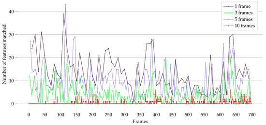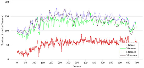 Figure 8 shows the number of trunks that can be observed from a single lidar scan, and when aggregating three, five or ten consecutive frames. Figrue Figure 9 shows the number of features matched between and for different number of consecutive aggregated frames. In Table 1 we show the average number of trunks observed, as well as the average number of trunks that can be matched with the global map after generating the DT graph. We also include the overall matching success rate, which is defined as the number of local DT graphs that have been successfully matched with the corresponding subsets of the global DT graph. From individual lidar frames, we were only able to obtain an average of 54.09 valid trunks in total. When aggregating consecutive scans, we were able to obtain approximately a twofold increase in the number of detected trunks, and a tenfold increase in the number of matched trunks. The number of aggregated frames thus has a significant quantitative impact on the performance of our algorithm with a difference of up to an order of magnitude in the number of matched trunks. As the number of trunks and their positions determines the appearance of the local DT graph, this will directly affect the number of features detected by our descriptor. The number of trunks observed is the key factor influencing the overall results of our algorithm. From Table 1 we can see the relationship between the DT matching success and the number of trunks. With a single frame observation, only an average 1.71 trunks are successfully matched; with three aggregated frames, there are in average 4.97 trunks matched; with 5 and 10 aggregated frames, there are more than 10 trunks in average that our algorithm can match with the global map, taking the overall DT match success rate to 100% in the latter case.