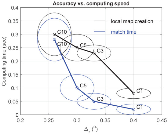 Dependency of the rotational accuracy and computation time on the choice of the number of aggregated frames. Both the local map creation time (black) and the similarity matching time (blue) are depicted. Number of frames ranges from 1 to 10 (C1, C3, C5, C10). Ellipses represent the 2 s.t.d. of the measurements.