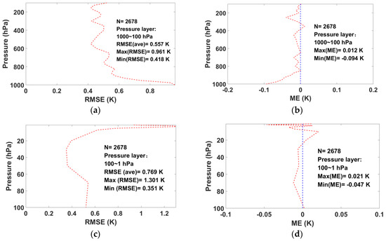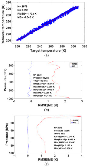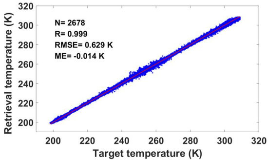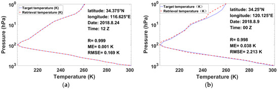 - When compared with the method that is based on simulated data to construct the network for retrievals, the method proposed in this study is superior in terms of retrieval accuracy during the comparison of the retrieval results. The temperature retrieval RMSE for the troposphere of the two methods can differ by approximately 1 K; the RMSE difference for the stratosphere is approximately 1.2 K.