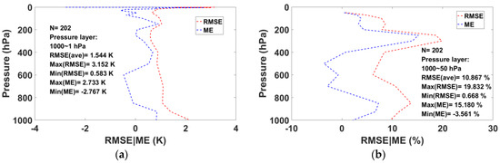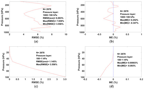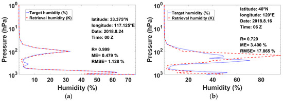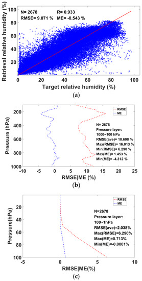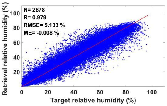 - The RMSEs of the relative humidity in the complete atmosphere as retrieved by the two sets of networks are both within 10%, while the RMSEs of the relative humidity in the troposphere retrieved by the two sets of networks are 6.003% and 10.608%, respectively.