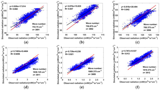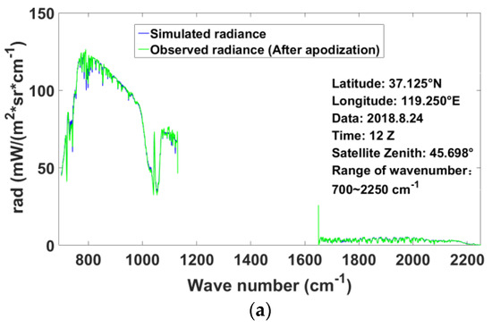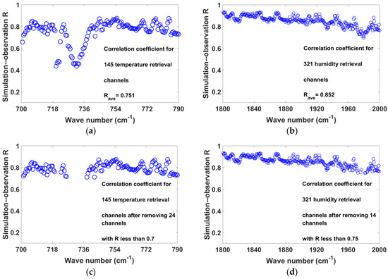 - A low correlation between the simulated and observed radiance exists in the range of 720–736.875 cm−1 and is mainly concentrated in the temperature retrieval band, while the correlation between the simulated and observed radiance of the water vapor channels exceeds that between the temperature channels.