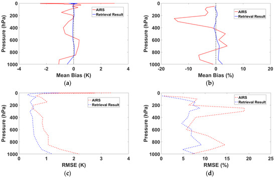 - Compared with AIRS products, the temperature shows great consistency in the troposphere, with the RMSE in most of the atmospheric layers being within 1.5 K, while the relative humidity shows better consistency below 500 hPa. Additionally, the retrieval results of the proposed method are more consistent with the ERA-Interim data than the AIRS products.