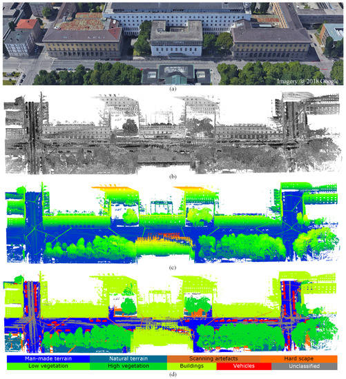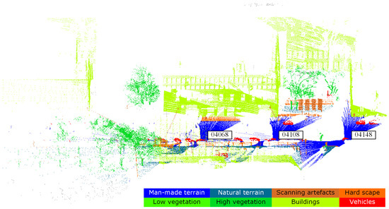 In the annotation, all the measured points in the scene were manually labeled with eight semantic classes following the ETH standard (Semantic3D.net benchmark) [21] and one unclassified class. The point-wise labels were assigned manually using CloudCompare 2.10 (https://www.danielgm.net/cc/). In Figure 1d, an illustration of points with these classes is given, with points of various labels rendered with different colors. To be specific, the details of these eight different classes are given in Table 2.