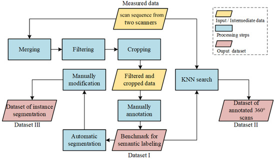Based on the annotation of points, we created three datasets serving the evaluation of related methods and algorithms, including a benchmark dataset for semantic labeling, test data for instance segmentation, and test data for individual labeled 360 scans. These three datasets are related to the two core tasks of semantic interpretation, namely the semantic labeling and object segmentation. In Figure 4, we give an illustration of the creation of these three datasets with involved processing steps and a workflow.