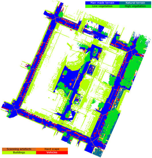 As shown in the workflow of Figure 4, for generating the benchmark dataset for semantic labeling, we started with re-merging all points of all the georeferenced single scans into a large point cloud. Then, the merged point cloud was preprocessed by the statistical outlier removal (SOR) filter and downsampled, with duplicated points deleted. These duplicated points were mainly caused by repetitive scans when the vehicle was waiting for traffic lights. After these two steps, the number of points has been greatly reduced. Sequentially, the distant points in the scan with a sparse density were cropped and removed. Based on the filtered and cropped point cloud, we conducted the annotation of points manually according to the standard stated in the previous subsection. The total number of annotated points is more than 40 million. With these annotated points, we created a benchmark dataset for the evaluation of semantic labeling. Here, only annotated points of the eight semantic classes are kept, and those which belong to the unclassified class are removed. In Figure 5, we show the entire annotated benchmark dataset with eight object classes. For evaluation purposes, the entire labeled dataset of the TUM city campus has been evenly divided into three areas according to the covered area size, and the numbers of points in these three areas are around 20 million, 16 million, and 13 million, respectively. In Figure 3a, the separation of these three areas is displayed. Points of each area are saved in the same ply files.
