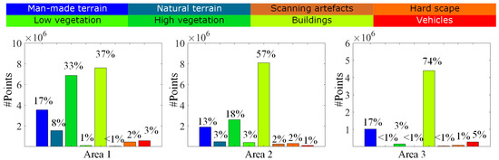 In Figure 6, a statistic overview of labeled points in different areas is illustrated. As seen from the statistics, we can find that for all three areas, the percentages of points from different objects show different distributions and occur in an imbalanced way. The various distributions of points from different objects reveal different scenarios in these three areas. The scenario in Area 1 is a street scene hybridizing man-made objects and vegetation with a relatively balanced distribution. However, the numbers of points from hardscape and scanning artifacts are still considerably less than those of buildings and ground. The scenario in Area 2 is the inner yard of the campus, with all types of objects but very few points of vehicles. Actually, there were only one or two parked cars inside the yard. The scenario of Area 3 is a street scene with closely packed facades and almost no vegetation. Plenty of parked cars were also scanned in this scene. As a summary, we can comment that building points show a dominating tendency in all three areas. The ground points of man-made ground occupy the second-largest percentage for all areas. This would be beneficial for tasks like building reconstruction and vehicle detection. However, the points of artifacts and hardscape are less than 3% among all the annotated points in no matter which area, which makes the recognition of such objects a challenge. For the supervised method, it is recommended to use the points of Area 1 as the training data, and points of Areas 2 and 3 as the test data. The imbalanced distributions of percentages of labeled points in each area should be considered when making the evaluation.