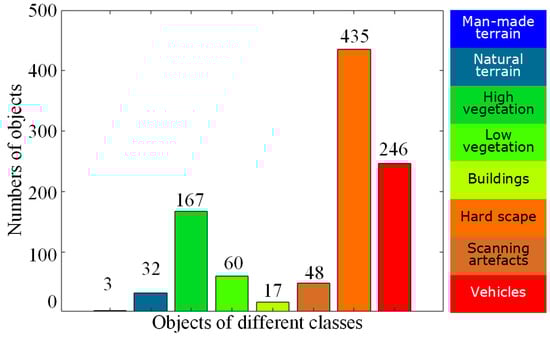 Based on the annotated benchmark for semantic labeling, we also conducted an instance segmentation to the labeled points, so that points of the same instance can be separated and assigned with a unique label. For example, all points of a parked car are labeled as an individual object and rendered with a unique color. The instance segmentation is comparable to the labeled instances in the Paris-Lille-3D dataset. The creation of this dataset was achieved by two steps. The first step is the automatic segmentation using an unsupervised clustering [22]. Then, in the second step, a manual modification was carried out to correct errors and refine the boundaries of objects. In Figure 7, the instance segmentation of the labeled points is displayed. In total, there are 1002 objects of eight classes mentioned above labeled and segmented. The numbers of objects from different classes in the dataset for instance segmentation are given in Figure 8. As seen from the figure, we can find that there are a vast number of trees and vehicles that have been segmented and annotated. This could be a useful aspect for related tasks.