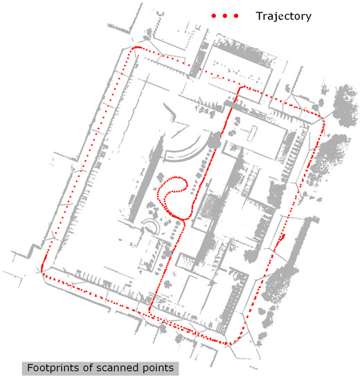 For the single 360 laser scans from both scanners, we conducted a nearest neighbor search for assigning the points sequentially with a possible label, according to the annotated points in the large-scale benchmark dataset. In Figure 9, the trajectory of the MLS vehicle is illustrated by red dots (representing equal time steps). As can be seen from the trajectory, the scanning data include two loops covering the inner yard and outer area of the campus, which can be used for the evaluation of SLAM methods like LiDAR-based Semantic SLAM. To do that, the georeferenced 360 scans can be transformed back to the sensor’s coordinate frame, i.e., the motion compensation and direct georeferencing achieved by the INS can be undone, and the task for the SLAM method under consideration would be to replace the INS. The labeled sequence of scans is comparable to the labeled sequences of scans in the SemanticKITTI dataset. For the points in each scan, a point was given the same label as the nearest neighbor in the annotated scene within a given threshold (0.3 m). If there are no points found in the given radius, the point was labeled to belong to the unlabeled class. In Figure 10, annotated points of single 360 laser scans are displayed. Compared to the annotated points in the large benchmark dataset, the annotated single laser scans contain both the geometric characteristics of the scanners and the classification labels of the points.