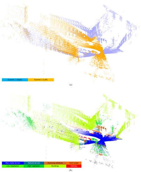 The annotated single 360 laser scans. (a) Points of two 360 scans from different scanners (i.e., left and right ones) at the same time of data acquisition. (b) Annotated points of two 360 scans at the same time of data acquisition.