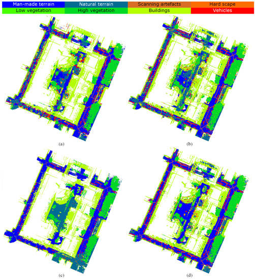Comparison of classification results using different methods. (a) Classification result using PointNet [23], (b) classification result using PointNet++ [24], (c) classification result using DEGO [25], and (d) classification result using HDL [13].Comparison of results using different methods.