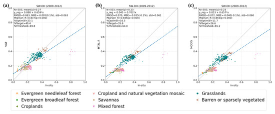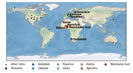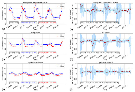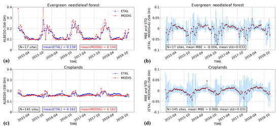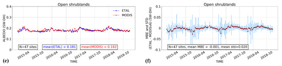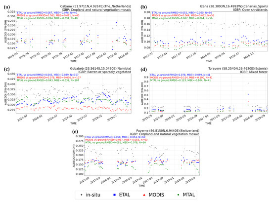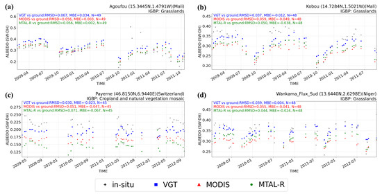 - Temporal and local at ground stations: In Section 3.1, a set of ground stations are considered that either belong to the AMMA-CATCH (http://www.amma-catch.org/), BSRN (https://bsrn.awi.de/) networks or are exploited within the GBOV project (details in Section 2.2). The data collected at these stations were used to qualitatively assess the VGT and ETAL products. For the sake of comparison, MODIS and MTAL-R (or NRT) surface albedo data were also included in the analyses. The strategy employed to calculate comparable albedo values for the satellite-based products is discussed in Section 2.5.