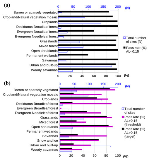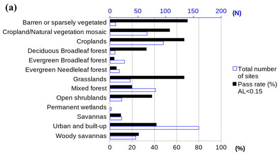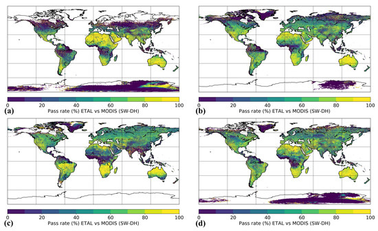 - Pass rate mapsAnother approach to quantifying the quality of ETAL (with respect to MODIS) over the full globe consists of assessing, on the one hand, its data rate (%) (or product temporal coverage) and, on the other hand, its pass rate (on the basis of the threshold requirement in Table 5) (%) for all pixels. The pass rate is defined as in Section 2.4. Figure 15 shows both the data rate and the pass rate for ETAL versus MODIS prior to filtering bad-quality surface albedo values and after filtering (referring to Section 2.5). Comparing Figure 15c and Figure 15a, one sees that many data are lost in the filtering process, particularly over tropical areas that belong to the inter-tropical convergence zone (ITCZ). In return, pass rates are substantially improved when good values (filtered data) are kept, as revealed by the differences over Siberia, Mexico and South America, among others (Figure 15d versus Figure 15b). This observation stresses the importance of the information distributed together with the albedo variables (quality flag, information about the age and uncertainties).Averaging the observations of both the data rates and pass rates (after filtering, Figure 15c,d) over the longitudes (for a given latitude) enables the construction of the rate profiles in Figure 16. It shows two maxima for the pass rate at about 25°S and 25°N, with a higher value of around 82% for the southern hemisphere one, unsurprisingly caused by the large high-pass-rate areas, viz., Australia and Southern Africa. We can also observe that from about 52°S to 52°N, the pass rate is over 50% on average, with a small band coinciding with the ITCZ zone (about 5°S to 10°N), where it falls to lower values of around 40%. The ETAL data rate, also shown in Figure 16, presents two peaks, both at about 75% roughly at 27°S and 20°N. After filtering (Section 2.5); more than 50% of ETAL data, on average, remain between 42°S and 50°N.Figure 15. Mean yearly ETAL data rate and ETAL pass rate with respect to MODIS over the period 2015–2018: (a,b) before pre-processing the data (filtering on the quality flag and other criteria); and (c,d) after filtering. The white color indicates the absence of data (either missing in (a,b) or filtered at the preprocessing step in (c,d)).Figure 15. Mean yearly ETAL data rate and ETAL pass rate with respect to MODIS over the period 2015–2018: (a,b) before pre-processing the data (filtering on the quality flag and other criteria); and (c,d) after filtering. The white color indicates the absence of data (either missing in (a,b) or filtered at the preprocessing step in (c,d)).Figure 16. Mean yearly ETAL data rate and ETAL versus MODIS pass rate averaged per latitude (after filtering with the preprocessing). Any latitude that did not have a minimum number of 10 pass rate values was discarded.Figure 16. Mean yearly ETAL data rate and ETAL versus MODIS pass rate averaged per latitude (after filtering with the preprocessing). Any latitude that did not have a minimum number of 10 pass rate values was discarded.