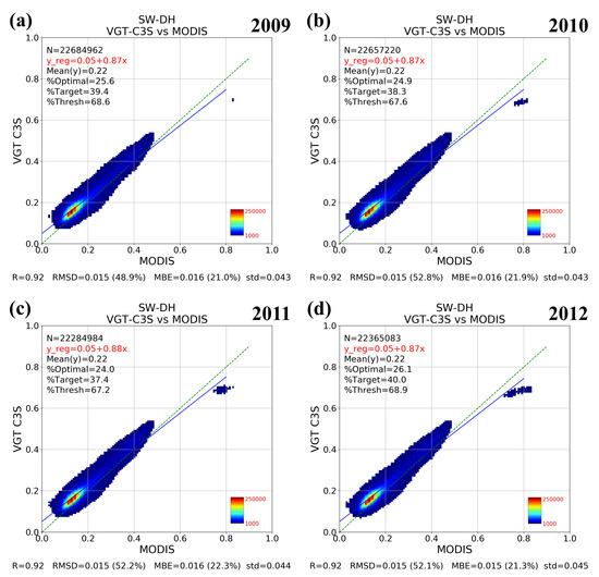 - Statistics of the differencesDensity scatter plots for each year are displayed in Figure 13. As expected from the observations in Section 3.2.2, ETAL and MODIS are very well correlated, with threshold pass rates beyond 90%, and the optimal pass rates for ETAL are also more than twice those of VGT. Standard deviation values of the differences are also substantially lower than in the VGT case. For the years 2016–2018, ETAL albedo values of around 0.3–0.4 are slightly higher compared with MODIS albedo values. Again, ETAL underestimates the snow albedo (AL ≃ 0.8) compared with MODIS, but, overall, there is a very good match between the two datasets. This can be seen from the weaker scattering of the pixels along the regression line compared with Figure 12. The performance statistics are compiled in Table 11.Figure 13. Density scatter plots for the inter-comparison of ETAL versus MODIS for: (a) 2015; (b) 2016; (c) 2017; and (d) 2018. To maintain a reasonable number of samples, a spatial subsampling of 1:10 is considered. The green dashed line is the 1:1 line, and the blue line is the regression line. Absolute MBE and RMSD are calculated over albedo values less 0.15 while relative MBE and RMSD (in %) are calculated over albedo values greater than 0.15.Figure 13. Density scatter plots for the inter-comparison of ETAL versus MODIS for: (a) 2015; (b) 2016; (c) 2017; and (d) 2018. To maintain a reasonable number of samples, a spatial subsampling of 1:10 is considered. The green dashed line is the 1:1 line, and the blue line is the regression line. Absolute MBE and RMSD are calculated over albedo values less 0.15 while relative MBE and RMSD (in %) are calculated over albedo values greater than 0.15.