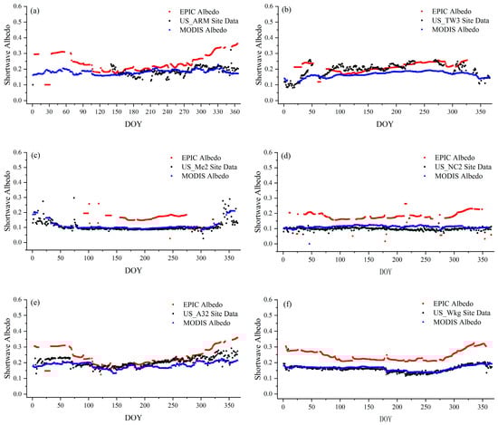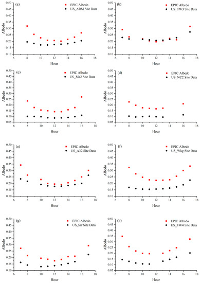 The diurnal variation of surface albedo is related to the solar zenith angle, and the surface albedo decreases as the solar zenith angle decreases. Solar radiation as the denominator when calculating albedo is the strongest in the middle of the day, and so albedo has a minimum value at noon. In addition, the diurnal variation of surface albedo is caused by changes in the atmosphere and the surface through the day, and variations in cloudiness are primarily due to diurnal or synoptic processes [42]. This characteristic of the diurnal variation of surface albedo shows in both ground-based observation and satellite estimations. The same characteristic was found in Bao and Liu’s study [27,28]. The solar zenith angle has a great influence on the albedo over forests when the vegetation grows well or on snowy days [43]. However, the ground-based observations do not change much, while the EPIC albedo shows a “U” shape over trees, as shown in Figure 4c,d (evergreen needleleaf forests) and Figure 4i,j (woody savannas). Hence, the diurnal variation of albedo can be analyzed with the EPIC albedo.