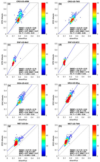 EPIC provides a high temporal resolution of surface reflectance data, affording the possibility of obtaining hourly surface albedo. In this study, the estimated EPIC albedo in 2016 was compared with the AmeriFlux site observations. Figure 5 shows the comparison of the hourly EPIC albedo and the ground-based observations under different land cover types, and the statistics are given in Table 2. R represents the correlation coefficient, Fit is the equation of the fitted curve, and the color bars and numbers on the right indicate the density of the matching data.