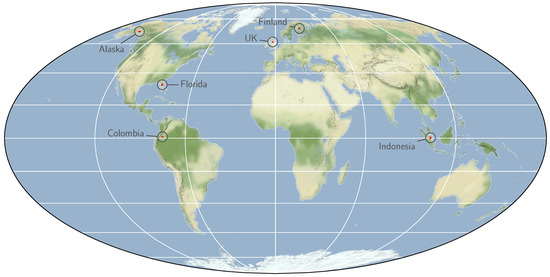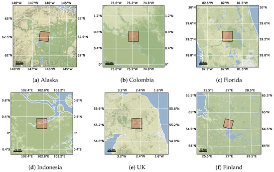 We have selected six study sites across a broad range of forest biomes: Alaska, Florida, Finland, UK, Indonesia, and Colombia. The locations of the study sites are shown in Figure 1 and in more detail in Figure 2. The reference maps for each study site were constructed from the GlobalForestWatch data set [10] as well as a country-specific land cover map for the corresponding year. It is assumed that both data sets contain inaccuracies for different reasons: The Hansen data set is derived from a Machine Learning approach and hence may not take into account local expert knowledge about differences between biomes. The country specific landcover maps, on the other hand, are released less frequently and only provide a snapshot at a certain time. They, therefore, do not capture land cover change during the study period. For these reasons, only pixels where both data sets agree were used as reference throughout the study.