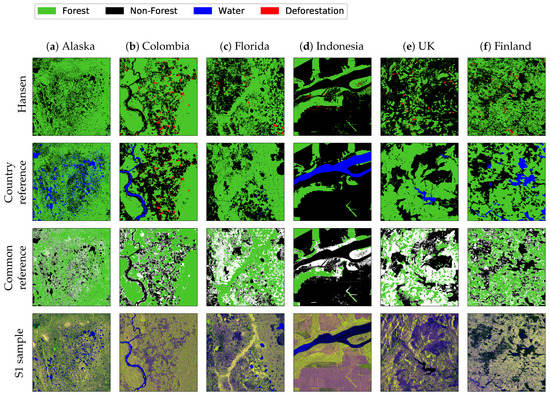 Figure 3 shows the Hansen maps as well as country specific reference data for each of the sites. The third row indicates the areas of agreement between the two. The last row shows a sample Sentinel-1 image for the beginning of the respective study period. Note that the Colombian reference data set is the only one that provides a deforestation class, which is why the image labeled “country reference” shows a few red patches for Colombia.