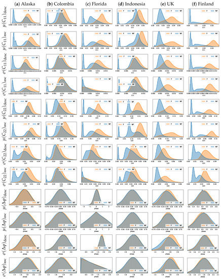 As a general observation, both VV and VH backscatter are larger for forested areas than for non-forested areas, on average. However, the individual distributions appear very different across different study sites. For Alaska, the distributions are nearly identical, whereas for Finland and the UK, the distributions separate very well. An interesting observation can be made about the phase difference. Overall, it seems that there is essentially no information contained in the phase difference when it comes to distinguishing forest from non-forest. The exception is the UK study site in descending orbit, and to some extent Finland, where there is a clear shift between the distributions for the two classes. Less apparent differences are also visible for Alaska and Colombia. Contrary to what has been found by Quegan et al. [13], the histograms of the temporal standard deviation of VV and VH backscatter seem to suggest that forested areas have a larger rather than smaller temporal variability compared to non-forested areas. This is in particular true for regions with pronounced seasonality such as the UK, Alaska, and also Florida, but also holds true to a lesser extent for Colombia and Indonesia. The standard deviation of the phase difference shows no difference between the two classes.