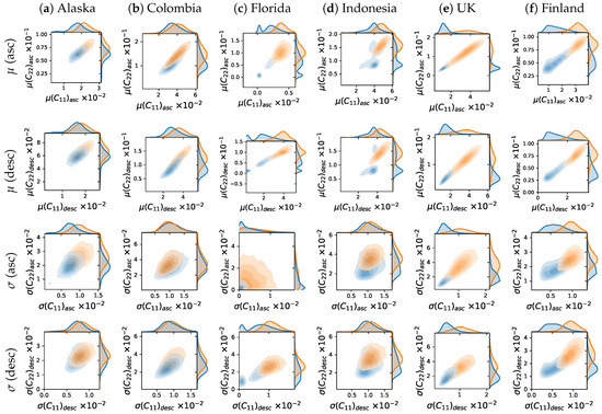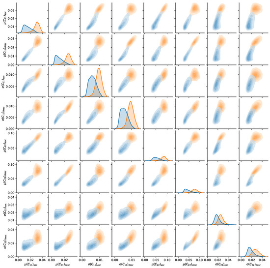 In addition to the univariate distributions, Figure 5 shows two-dimensional Kernel Density Estimation (KDE) plots for pairs of variables. Each subfigure shows the distribution of and split between forest (in orange) and non-forest (in blue). The first two rows show the annual mean (), whereas the last two rows show the standard deviation (), each for ascending and descending orbits. The shade represents the observation density, with darker shades indicating higher density.