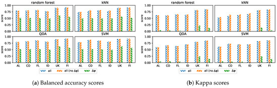 Figure 8a shows the balanced accuracy scores for each of the classifiers and study sites. Similarly, Figure 8b shows Cohen’s Kappa scores instead. The three different cases presented here correspond to the last three sections of Table 2.