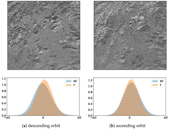 Due to the way the satellites orbit the Earth, roughly half of the data are acquired while the satellite is moving from south to north (this is called ascending orbit) and the other half when it is moving from north to south (descending orbit). This results in different look angles which have a particular impact on the appearance of terrain with topography. This effect can be partially accounted for using a processing step called terrain flattening. However, we do not apply this step as it does not preserve the phase information. Instead, throughout this study, we treat the measurements in both orbits as separate variables. Aggregating over them would artificially increase the variability over pixels affected by topography which would reduce the separation between forest and non-forest distributions.