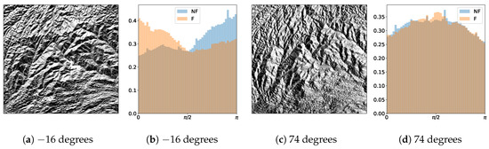 (a,c) depict hillshade images for illumination (azimuth) angles of −16° and 74°, respectively. This corresponds to the perceived illumination intensity for a source pointed in azimuth direction (a) of the ascending orbit and in perpendicular orientation (c). The histograms to the right of the hillshade images (b,d) show the distribution of this illumination intensity separately for forest and non-forest.
