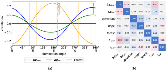 The histograms clearly show that there is a correlation effect between forest cover and terrain slope orientation that disappears when the illumination source is rotated by . Figure 11 quantifies this correlation and its dependence on the azimuth angle: Figure 11a shows the correlation of the mean VV-VH phase difference in ascending and descending orbit as well as the forest cover with the hillshade image for different azimuth angles . The dashed and dotted lines indicate the heading angle and perpendicular directions, respectively. For the ascending orbit, these lines correspond to the special cases shown in Figure 10. Figure 11b shows the correlation with additional terrain parameters such as elevation and slope in matrix form. There is a mild correlation between the hillshade illumination at and the phase difference of in the descending orbit, and in the ascending orbit. Combined with the observed relation between forest cover and the hillshade illumination (correlation of ), this is sufficient to explain the small correlation between forest cover and phase difference in descending orbit of . Albeit small, this correlation leads to the shift between forest and non-forest distributions shown in Figure 9a.