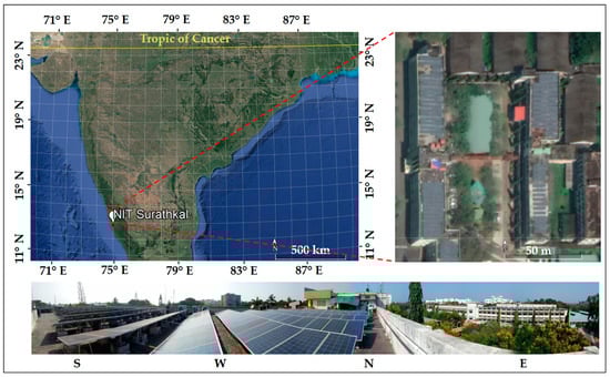 Figure 1 shows the location of National Institute of Technology Karnataka on the map of India with the rooftop image of PV panels and the surroundings. NITK is located at a latitude of 13.0 N and a longitude of 74.8 E and an altitude of 24 m. The south Indian state of Karnataka leads Indian states in new rooftop PV attractiveness index [].