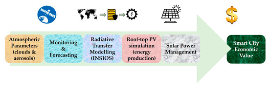 The innovation of this study has to do with the solar energy management from space using earth observation data and technologies. The ability to perform energy management remotely forms the current smart grid operational use and exploitation. To this end, we replicated and upgraded the work performed in previous studies and technical reports (e.g., [,,]), as to be applied for roof-top PV installations. For the simulation procedure, we firstly estimated the surface solar radiation reaching the PV panels on the horizontal plane []. Then, we made the transformations as to simulate the radiation at the tilted plane and finally we performed the conversions to reproduce the real PV energy production []. As a result, based on the simulation outputs, we compared the simulations with the real radiation and PV energy production values. This ‘simulation to reality’ aspect was initially introduced by authors in [], and with this study, we took it one step further by simulating the shadow effects at the roof-top level for the atmospheric, topographic, and geographical conditions of India.