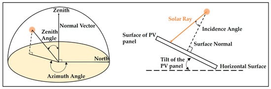 The geometric relationship between the incoming radiation and the plane of a particular orientation relative to the surface of Earth at a time can be described in terms of certain angles as shown in Figure 3 in which the tilt angle of the PV panel and the incidence angle of the solar ray is explained. The azimuth angle () is defined as the angular displacement of the beam radiation projected on the horizontal plane from the south. Solar zenith angle is defined as