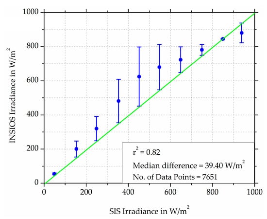 In this section, a comparison has been made between the solar irradiances obtained from the INSIOS simulations and the SIS measurements. Figure 4 shows the correlation of the INSIOS simulated irradiance and the irradiance measured from the silicon irradiance sensor. The temporal resolution of the irradiance in this analysis is 15 min. The coefficient of correlation is found to be 0.82 with a median difference of 39.40 W/m2. The dot plot with error bars is constructed by taking the average of the INSIOS irradiance for every 100 W/m2 averaged SIS irradiance and the error is calculated as the difference between the INSIOS and the SIS irradiances. It is observed that maximum cases have overestimations from INSIOS as compared to the SIS data while some cases have underestimations too. The error is seen to increase from 5 W/m2 to 173 W/m2 for the SIS irradiance varying from 100 to 500 W/m2, respectively and then decreases to 11 W/m2 for 900 W/m2 SIS irradiance with a sudden increase of 58 W/m2 at 1000 W/m2 of the SIS irradiance.
