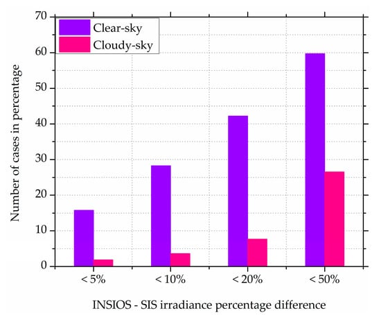 Column plot of percentage difference of INSIOS vs. SIS irradiance for clear-sky and cloudy cases.