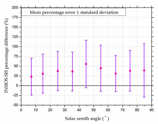 Variation of vs. INSIOS-SIS irradiance percentage difference for clear-sky with solar zenith angle.